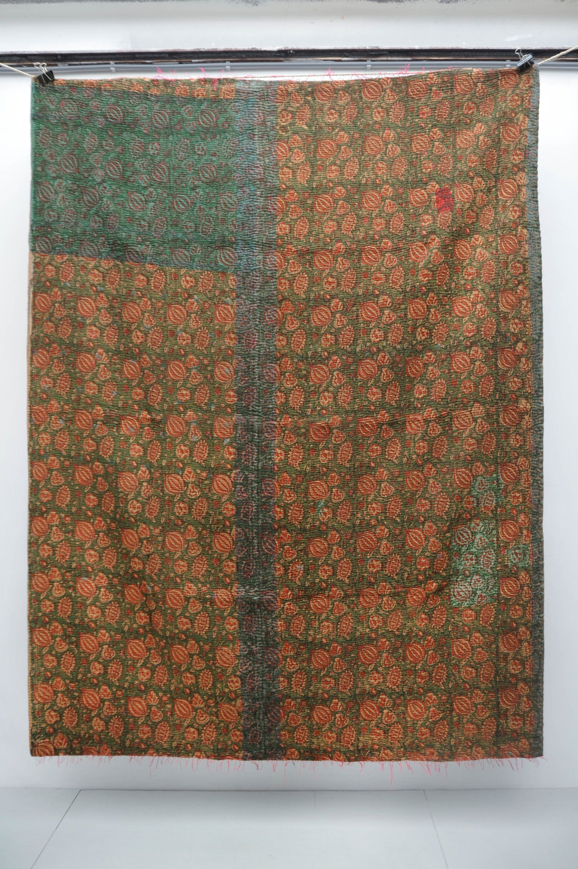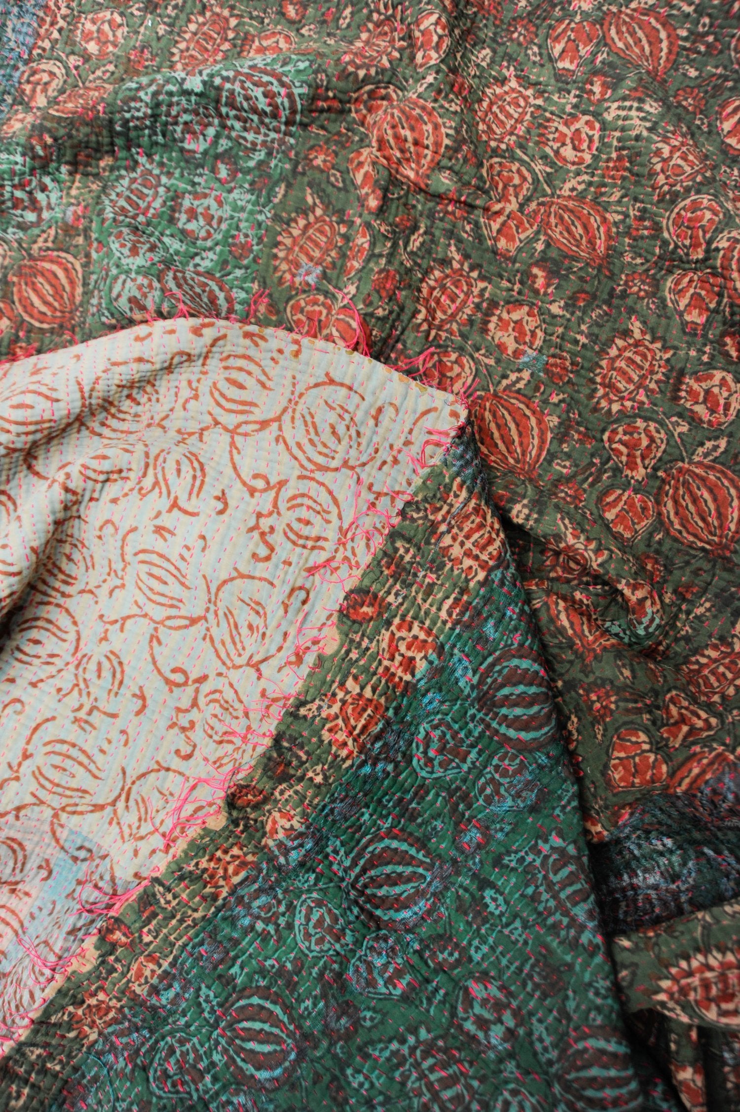 Each blanket is handpicked by myself in India. It is made from layers of upcycled cotton saris, meticulously hand-stitched with the iconic Kantha running stitch. The result is a one-of-a-kind, reversible blanket that features bold colors, intricate patterns, and a lightweight yet durable texture. The patchwork design tells its own unique story, with subtles imperfections that add to its charm and authenticity.