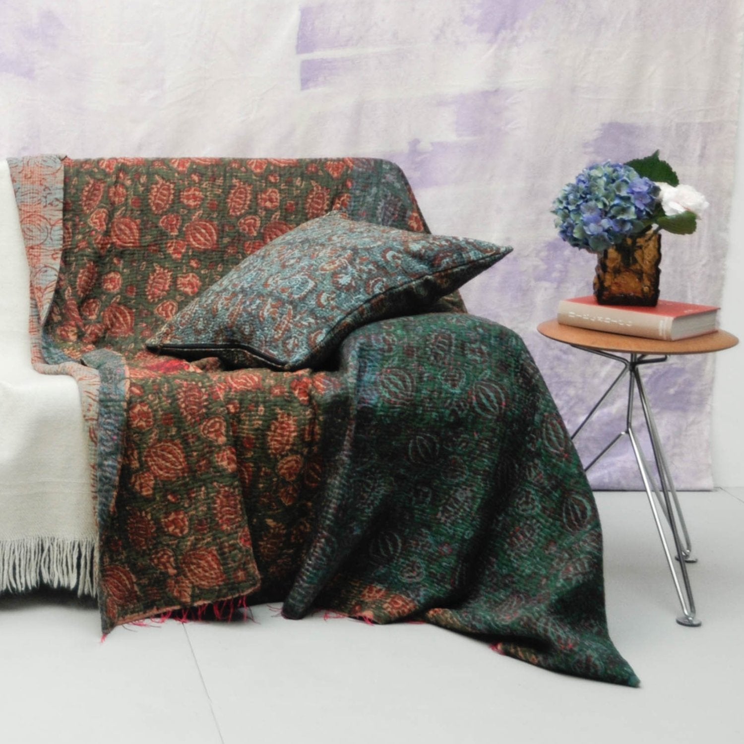To add an extra layer of history, This blanket is overdyed and blockprinted with vegetal dyes (Bagru prints) by our skilled artesans, conveying exquisite earthy tones.