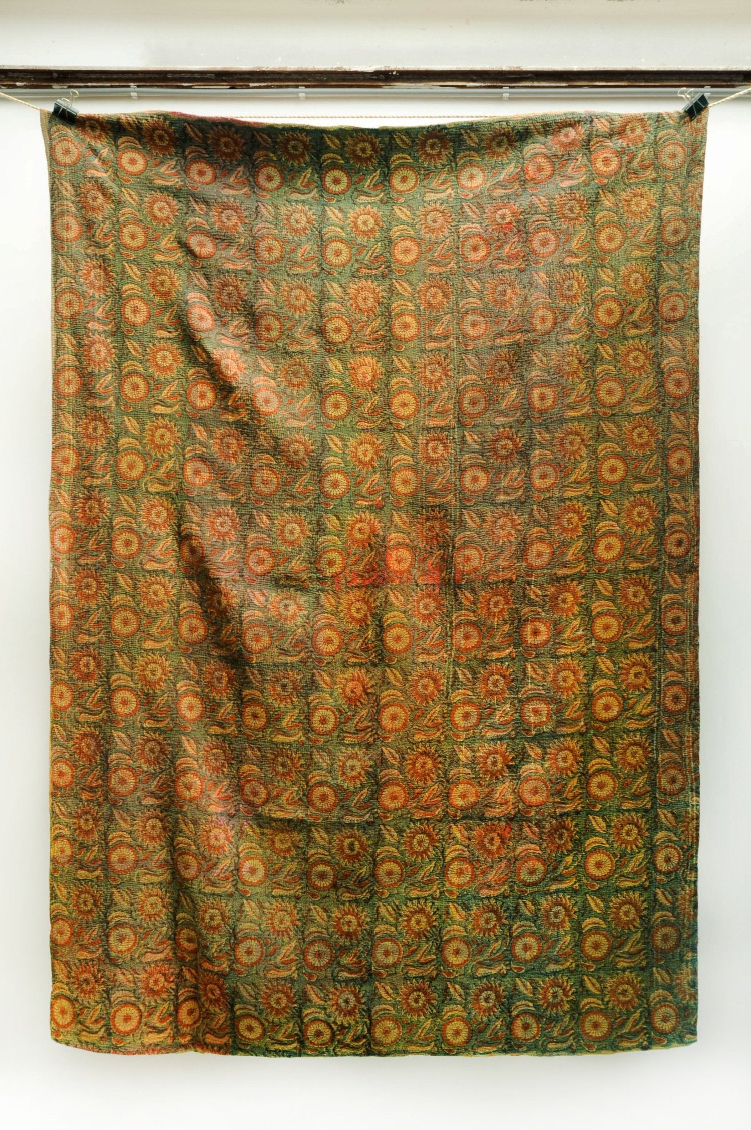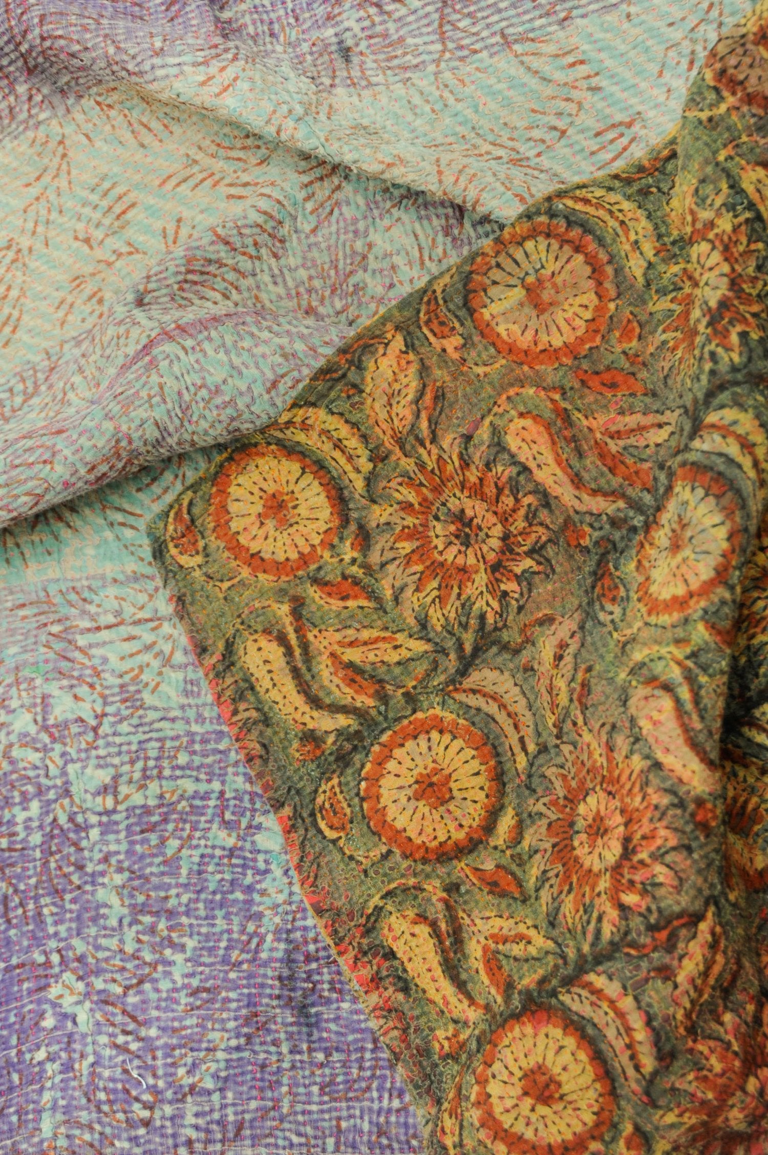 Each blanket is handpicked by myself in India. It is made from layers of upcycled cotton saris, meticulously hand-stitched with the iconic Kantha running stitch. The result is a one-of-a-kind, reversible blanket that features bold colors, intricate patterns, and a lightweight yet durable texture. The patchwork design tells its own unique story, with subtles imperfections that add to its charm and authenticity.