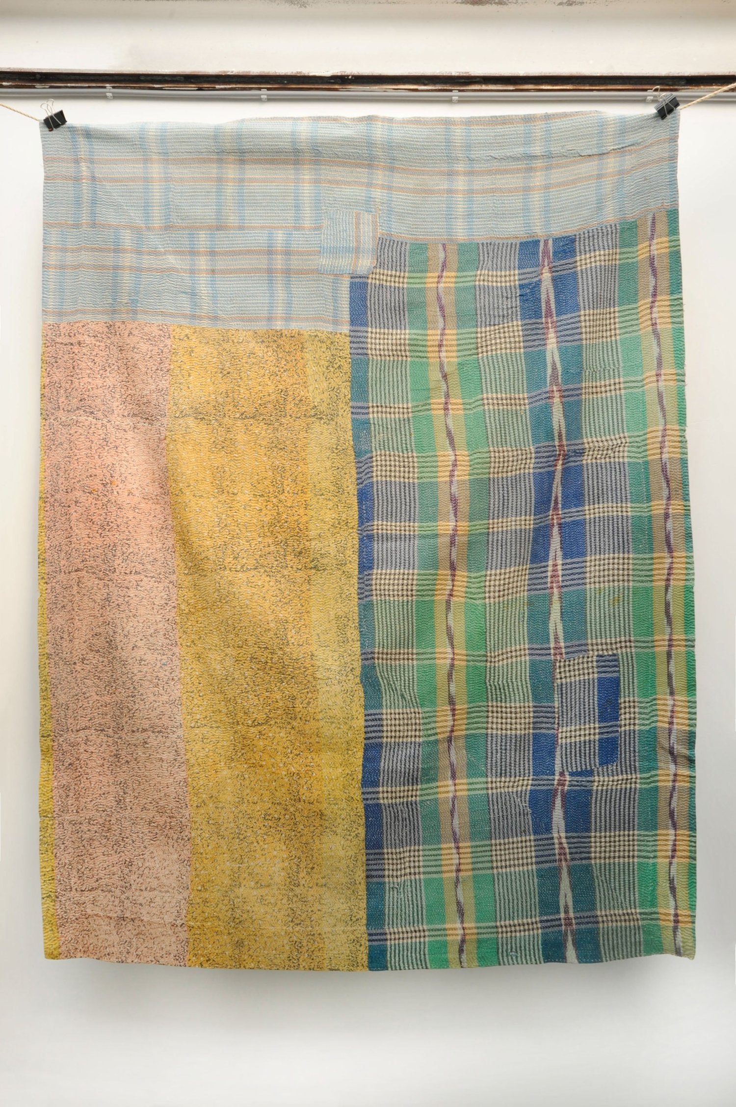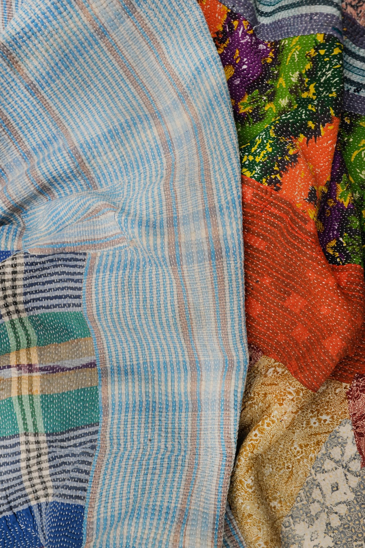 Each blanket is handpicked by myself in India. It is made from layers of upcycled cotton saris, meticulously hand-stitched with the iconic Kantha running stitch. The result is a one-of-a-kind, reversible blanket that features bold colors, intricate patterns, and a lightweight yet durable texture. The patchwork design tells its own unique story, with subtles imperfections that add to its charm and authenticity.